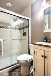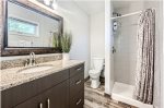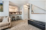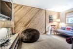 The middle level of the home features the main living space with kitchen, deck access, and a full bathroom. The kitchen has beautiful granite countertops, glass tile backsplash, and updated appliances including a dishwasher. Fully equipped with cookware, flatware, and utensils you will have everything you need to prepare meals in the home. The dining area is located next to the kitchen, the large table has 4 chairs and a bench with seating for 2-3 people. There is also a breakfast bar with bar stool seating for 2. The living room has contemporary furnishings, ceiling fan, 65 inch smart TV, and a wood fireplace. Settle in after a day of skiing with a warm fire and cup of cocoa. The deck is accessed from this room and is furnished with a private hot tub and gas grill. There is a small yard below the deck to make a snowman or play some yard games. There is another full bathroom with shower on this level, making it easy for everyone to get ready in the morning.