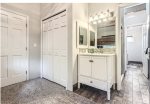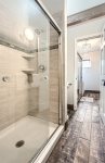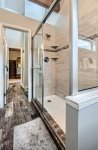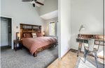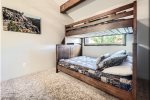 The top floor of the home hosts the main sleeping quarters. The large master bedroom has a king bed with adjustable sleep number settings and ceiling fan. There is a separate seating area with an arm chair and a desk workspace. A Jack and Jill style bathroom with 2 showers, 2 sinks, and 1 toilet room connects the master and bunk room. Each room has their own access and the doors close for privacy when needed.